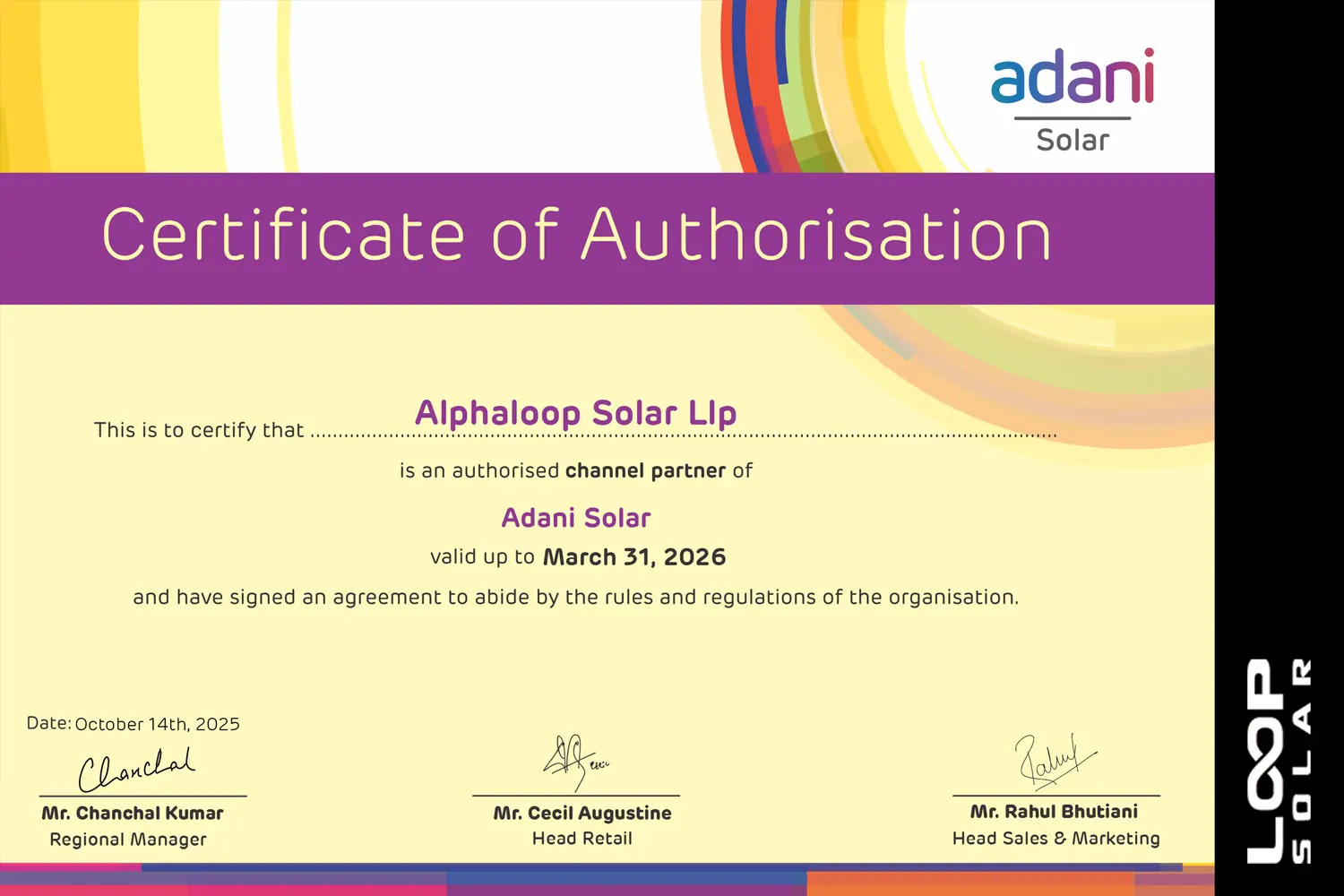 Always ask for the "Authorized Distributor Certificate" from the manufacturer. (See Loop Solar's Authorized Distributor Certificate).Loop Solar is transparent; we display our authorization certificates for Adani Solar, Hitachi, Hopewind, and Jio Sparq on our website and provide copies with proforma invoices.